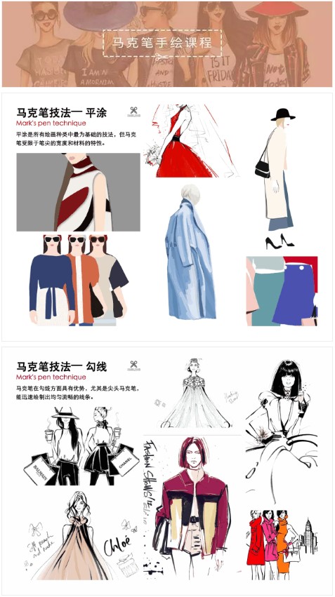 练好服装设计效果图、款式图是设计师学习的基本技能之一。而马克笔作为最快捷、最直观展现你思维的工具,它能在最短的时间内记录你的灵感,展现你天马行空的思维方式,它在服装课程的环节中是至关重要、必不可少的一节课。